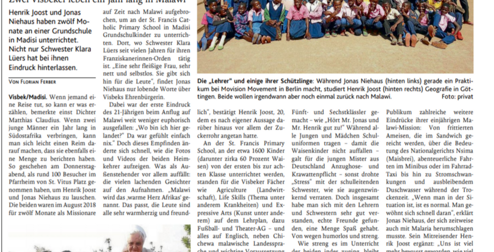 Visbeker helfen in Malawipascalthie113. Jan. 20201 Min. LesezeitArtikel in der Oldenburgischen Volkszeitung am 04. Januar 2020Quelle: Oldenburgische Volkszeitung; Text: Florian Ferber; Fotos: Niehaus/Joost/Malawi Hilfe Visbek Titelseite der OV am 04.01.2020Bericht der OV am 04.01.2020